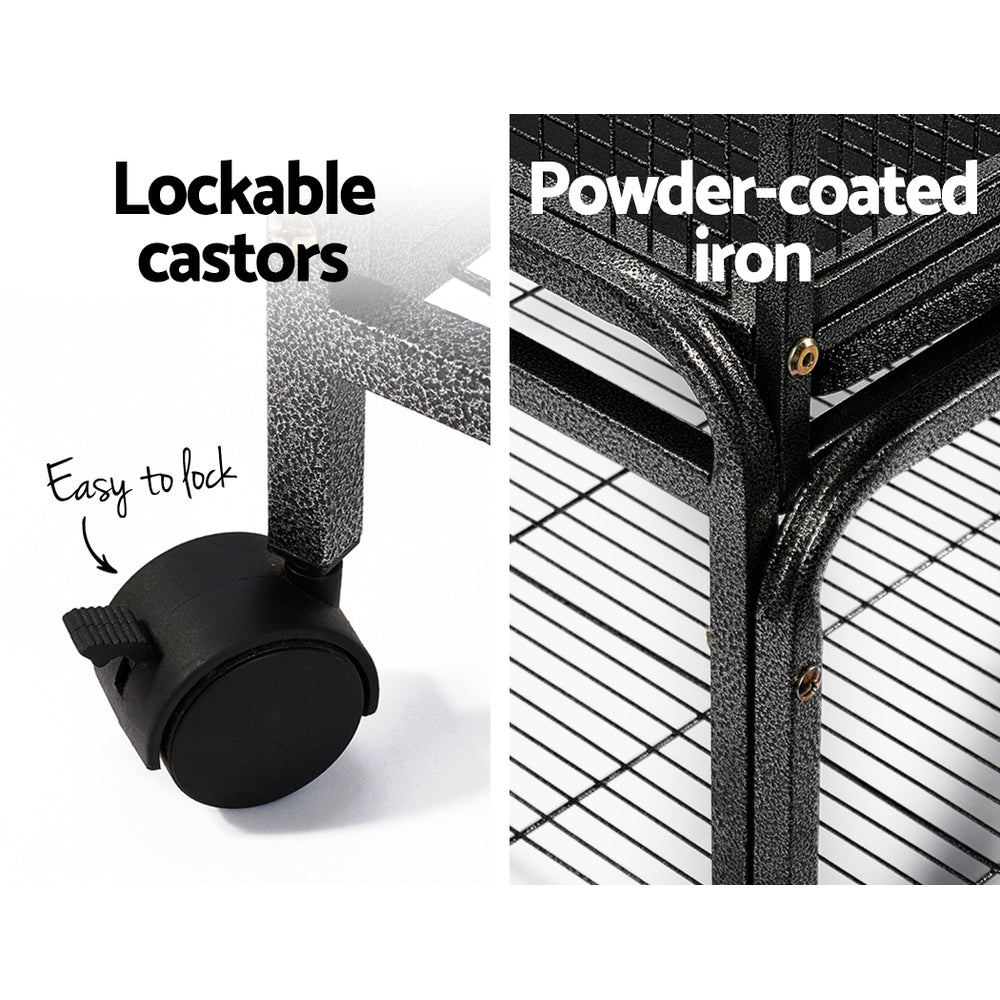 With roomy accommodation for birds of various sizes, the i.Pet Bird Cage is definitely the most comfortable roost for your fine-feathered friends. Made of high quality and durable wrought iron with a non-toxic powder-coated finish, the cage comes with a large access door with secured locks, two small food access windows, two timber perches, four food and water bowls and a removable slide-out tray for easy clean up. Better still, the palatial cage is set on a sturdy stand that features a bottom shelf for extra storage space and strong legs with castor wheels attached for easy mobility.